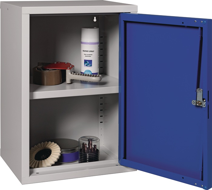 Construction stable en tôle d’acier thermolaqué · Portes en tôle pleine, verrouillables avec serrure à cylindre · Tablette à hauteur réglable, capacité de charge 15 kg