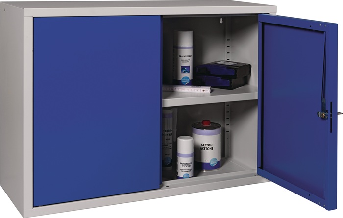 Construction stable en tôle d’acier thermolaqué · Portes en tôle pleine, verrouillables avec serrure à cylindre · Tablette à hauteur réglable, capacité de charge 15 kg